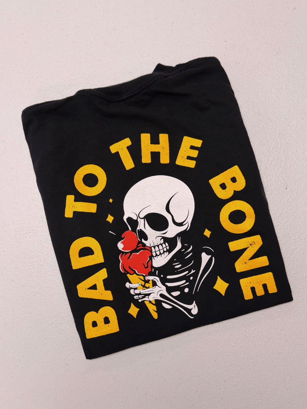 ’bad to the bone’ graphic on the front & back of this unisex black tee