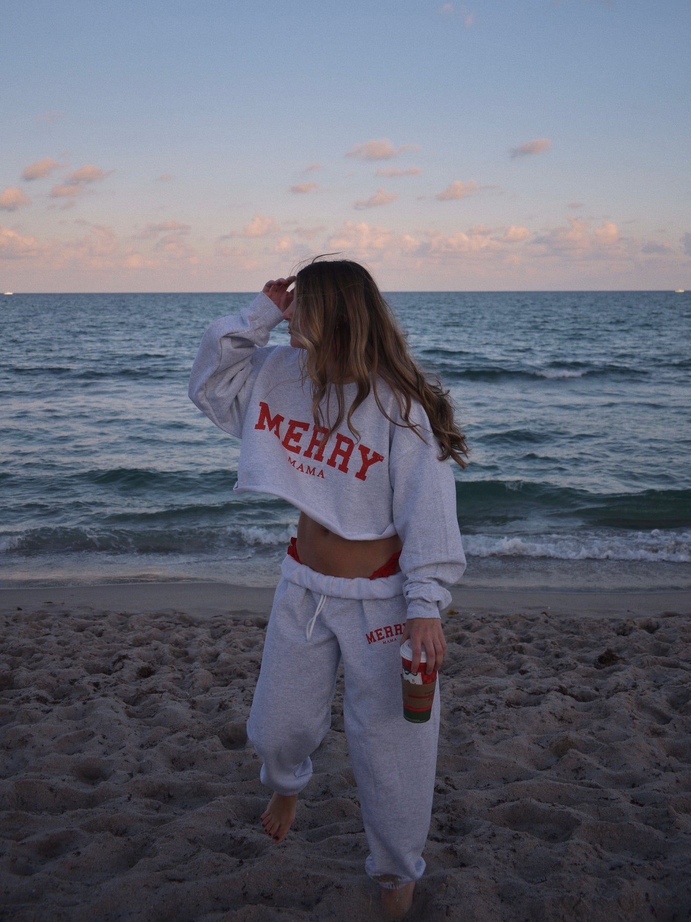 a classic crewneck sweatshirt with 'MERRY MAMA' printed on the front